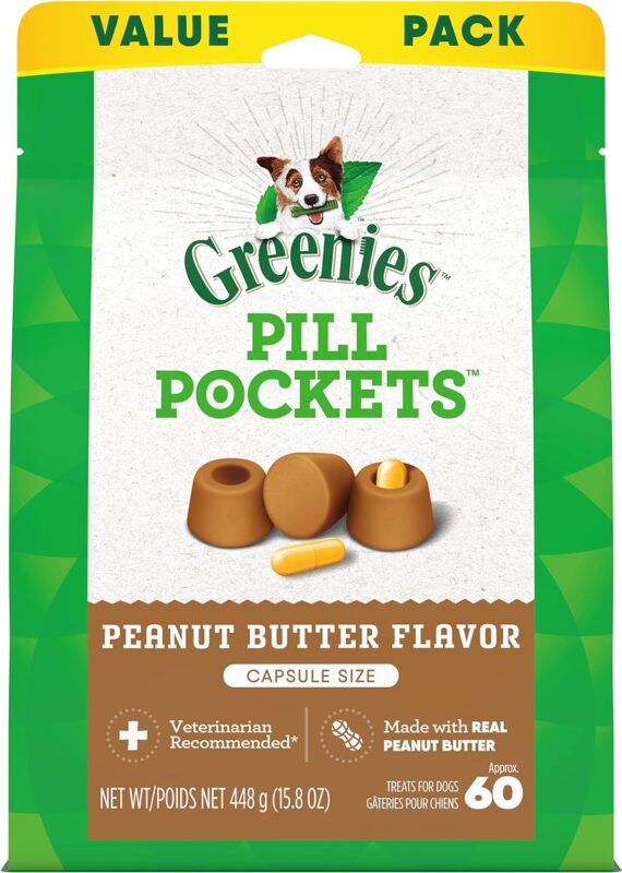 Greenies Pill Pockets for Dogs Capsule Size Natural Soft Dog Treats with Real Peanut Butter, 15.8 oz. Pack (60 Treats)